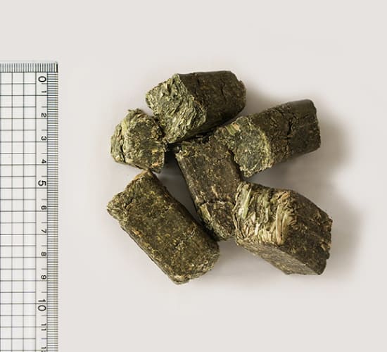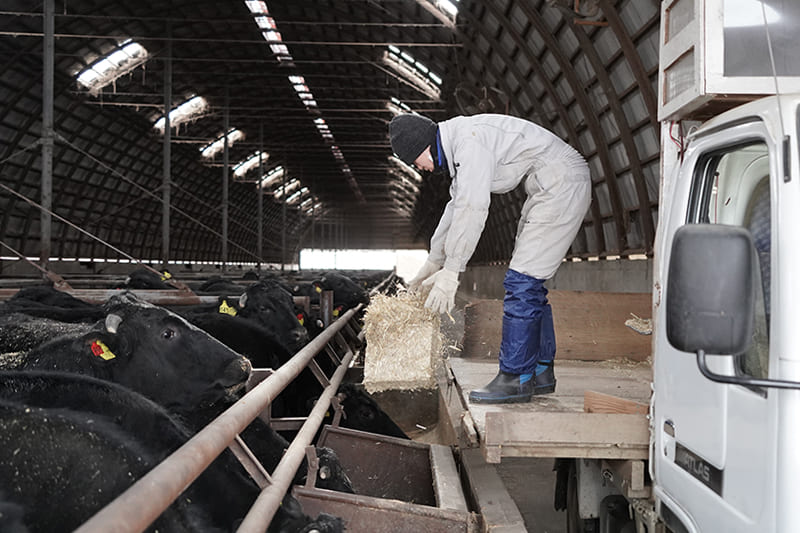 より安全でおいしいお肉をつくるため、南新得牧場では独自配合のブレンド飼料を採用しています。特に一番牧草(チモシー牧草)は北海道産にこだわっており、育成時期の「腹作り」を大切にしています。それは最終肥育仕上げ時期まで、こだわりのブレンド飼料の給与量を落とさずに食べさせるため。そしてどんなに良い餌を作っても沢山食べられる胃袋がなければ、良い牛が育たないと考えているからです。